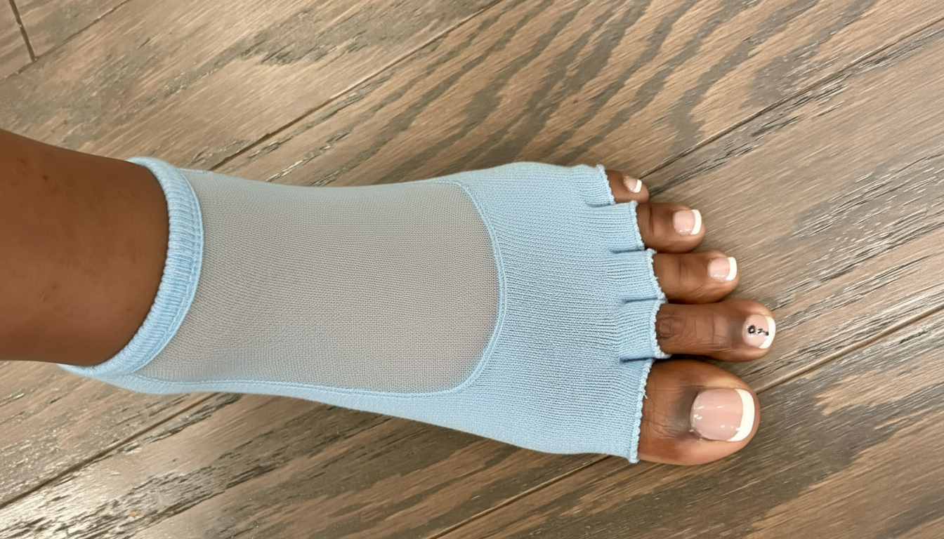 Five-toe socks with breathable mesh upper and full silicone grip sole. Designed for maximum stability and airflow during Pilates, yoga & barre.